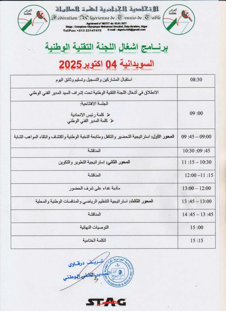 في إطار إستراتيجية تطوير كرة الطاولة الجزائرية تتشرف المديرية الفنية الوطنية، بدعوتكم لحضور فعاليات اجتماع اللجنة التقنية الوطنية المزمع إقامته يوم السبت 04 أكتوبر 2025 بمركز تحضير الفرق الوطنية والمواهب الشابة بالسويدانية (الجزائر العاصمة). وذلك من خلال حضور ممثليكم (المدير التقني الولائي / المدير التقني الرياضي للنادي) القسم الأول ذكور و إناث للاجتماع الذي ستنطلق أشغاله ابتداء من الساعة التاسعة صباحا